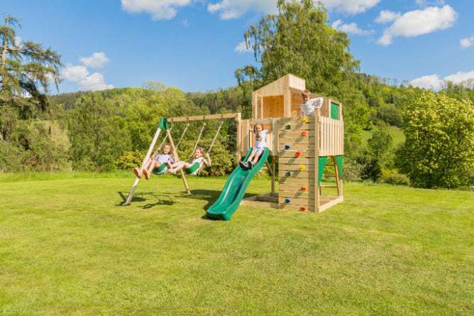 Une tour de jeu avec balançoire est idéale pour favoriser les interactions sociales. Les enfants peuvent jouer ensemble, apprendre à partager et interagir, ce qui développe des compétences sociales importantes comme le travail d'équipe, la communication et le respect. La possibilité de se balancer ensemble et de découvrir d'autres opportunités de jeu sur la tour renforce les liens sociaux et les amitiés. Avec une telle tour de jeu, vous créez non seulement une aire de jeu attrayante, mais aussi un lieu de rencontre où les enfants peuvent partager des expériences merveilleuses.