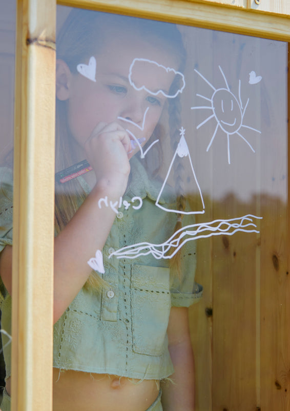 Les vitres des maisons de jeu sont souvent fabriquées en plexiglas. Il s'agit d'un plastique transparent, flexible, incassable et environ deux fois plus léger que le verre « traditionnel ». Ce matériau est donc un choix sûr pour une maison de jeu pour enfants.