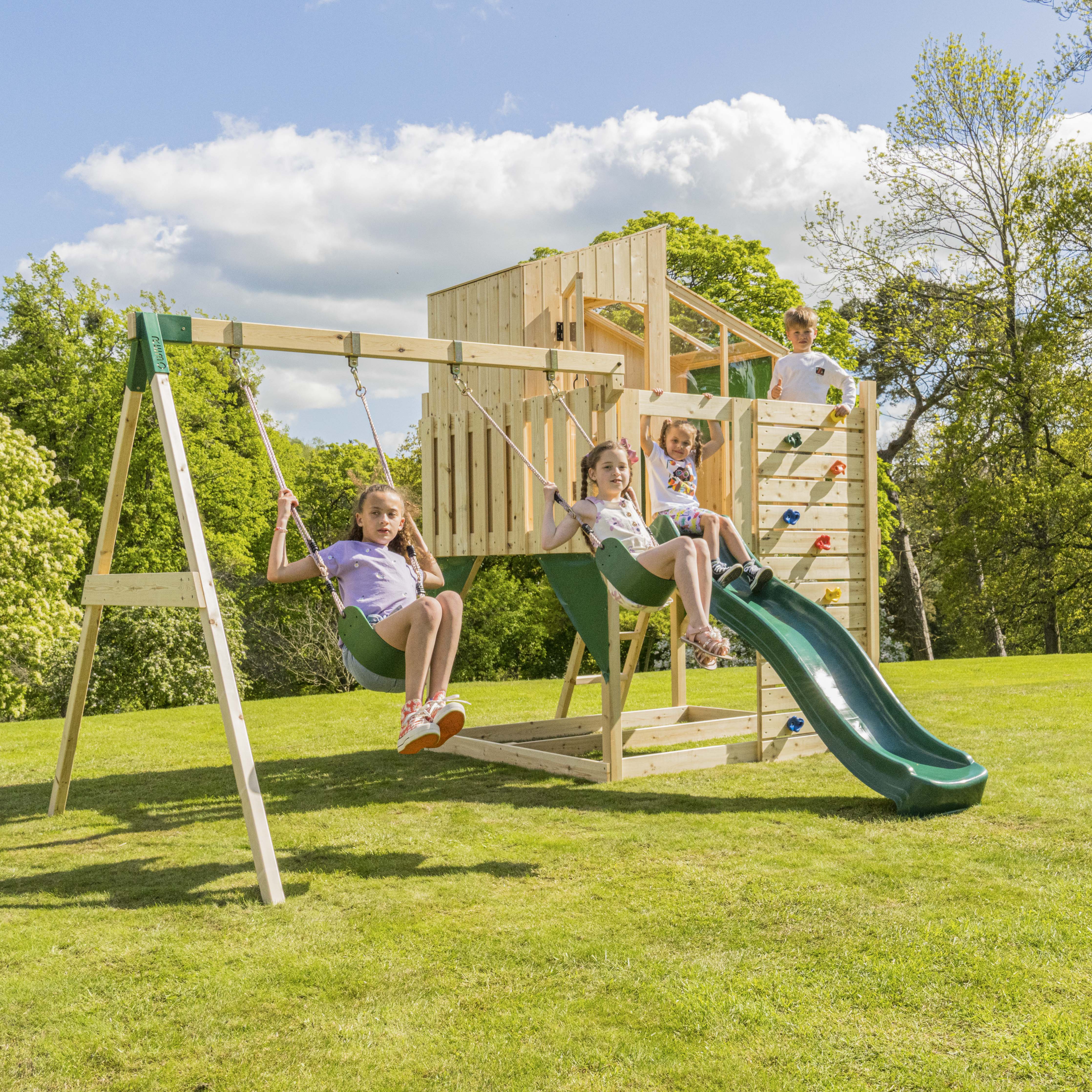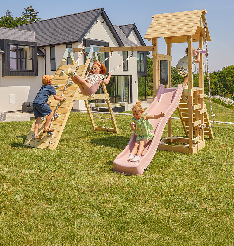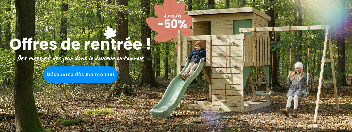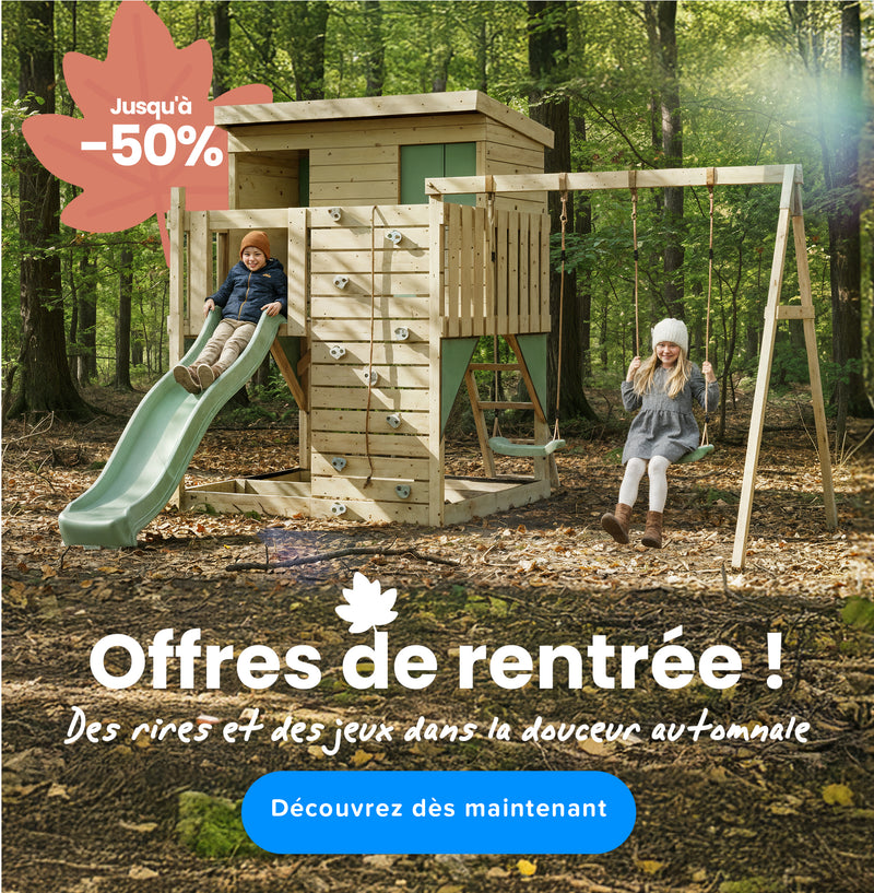 Le jardin est un formidable terrain de jeu pour les enfants, et nous souhaitons encourager les activités extérieures. En plus de la stimulation physique et de la dépense d'énergie, ces dernières favorisent également l'ímaginaire et la créativité. Tranformez ainsi votre jardin en un véritable espace récréatif. Nos jeux de plein air sont exclusivement fabriqués en bois de haute qualité, garantissant ainsi des produits parfaitement adaptés à un environnement extérieur, résistants et durables. Nous vous proposons des toboggans, tout un assortiment de balançoires mais aussi une incroyable sélection d'aires de jeux.