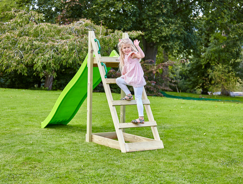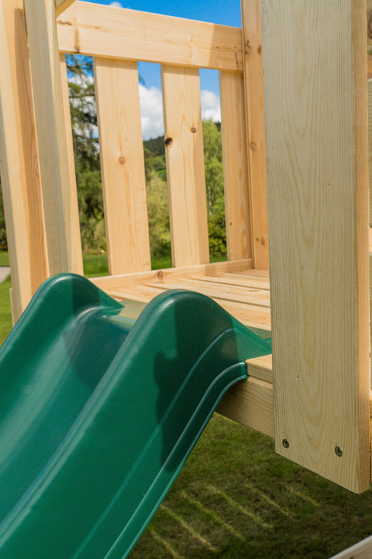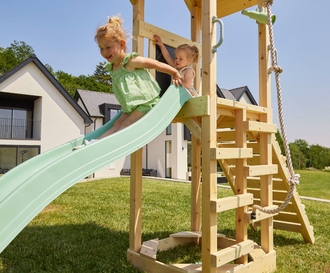 - Toboggans pour cabane de jeu : Le toboggan est accessible depuis l'étage supérieur de la cabane ou de la tour de jeu.