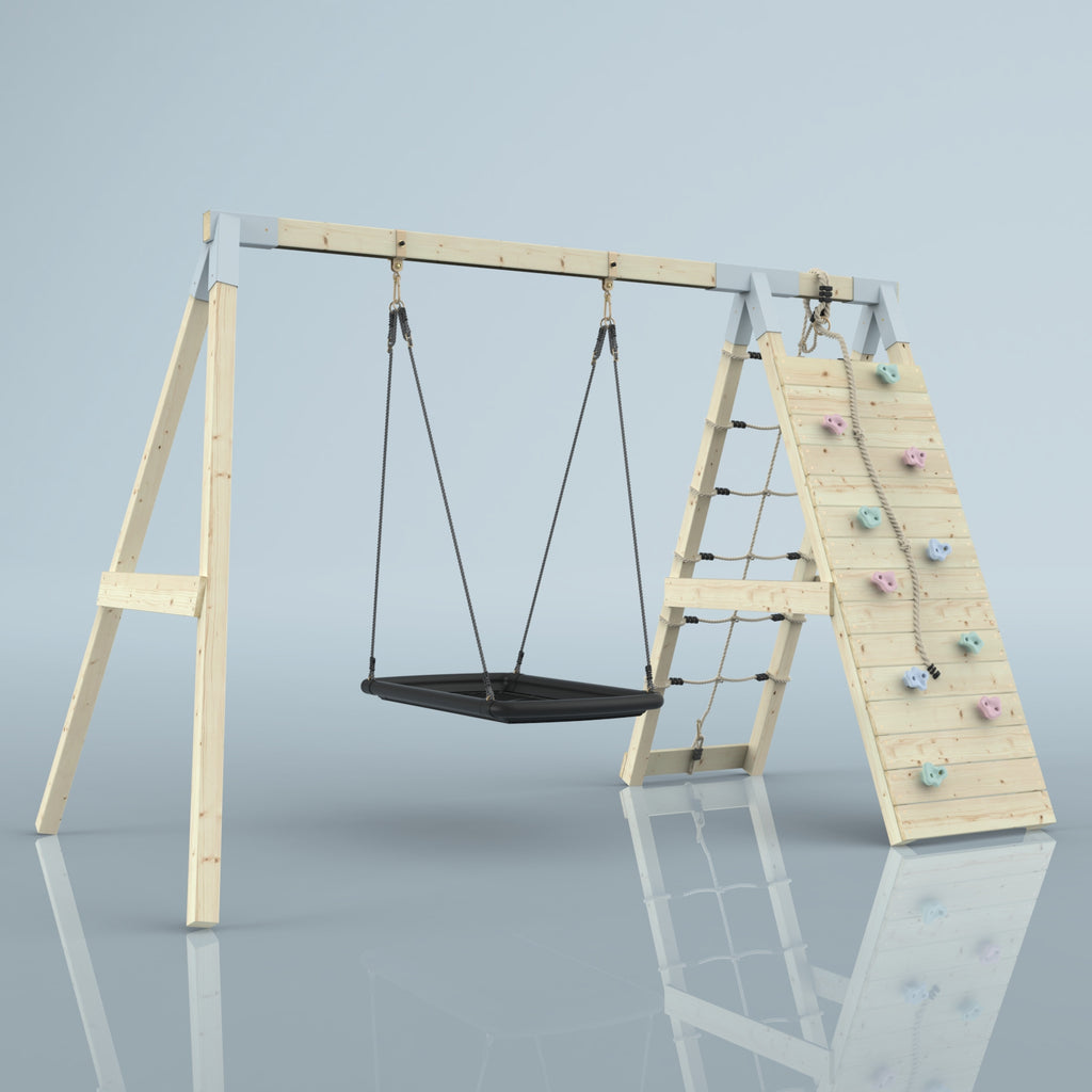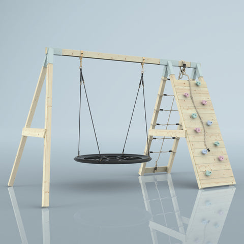 La PolarPlay portique à grimper Cacatoès est un magnifique set de balançoires en bois comprenant une grande balançoire nid ronde avec un portique à grimper, qui constitue le complément parfait pour ton jardin. Les enfants peuvent laisser libre cours à leurs pensées en observant les nuages sur la balançoire en nid et peut-être qu'à ce moment précis, un nuage de cacatoès passera par là ?