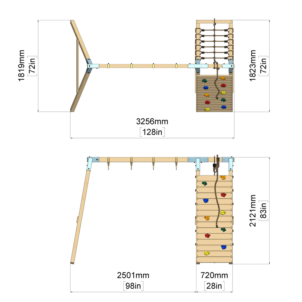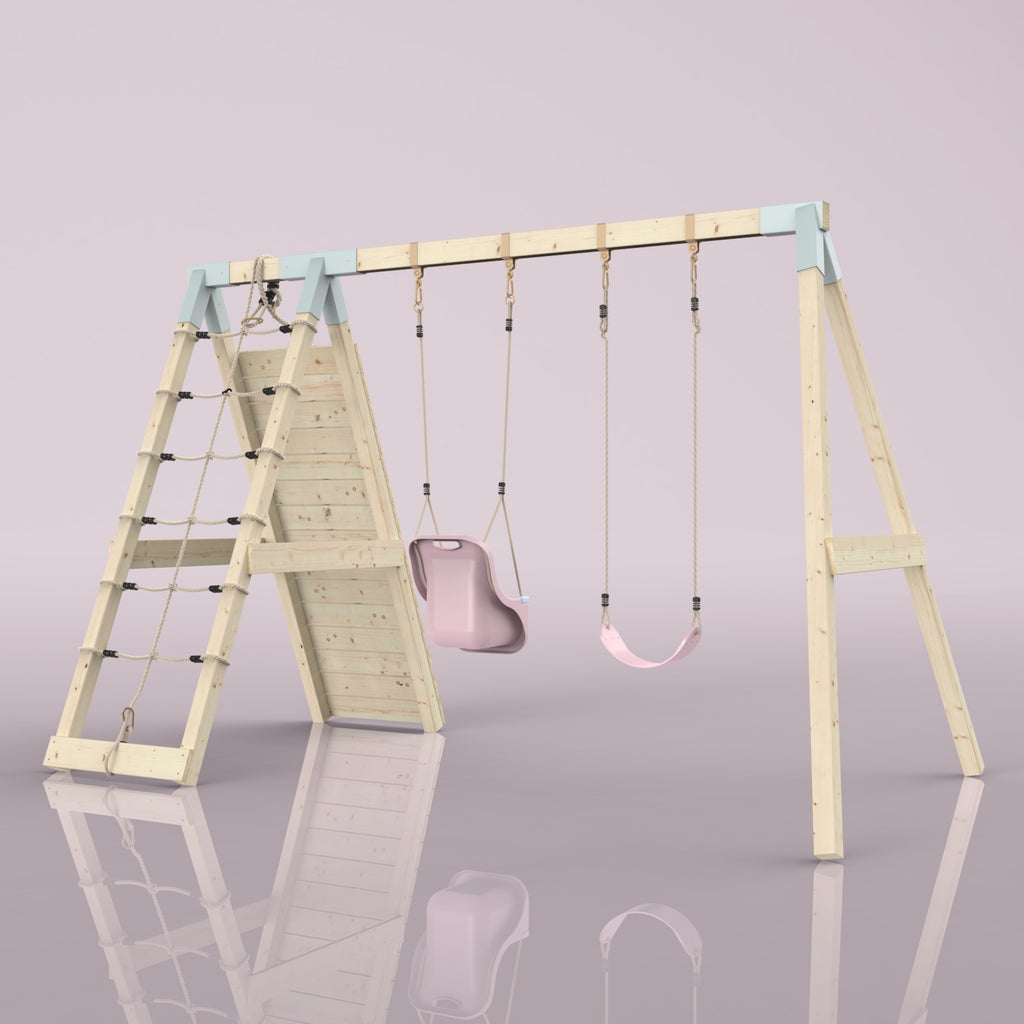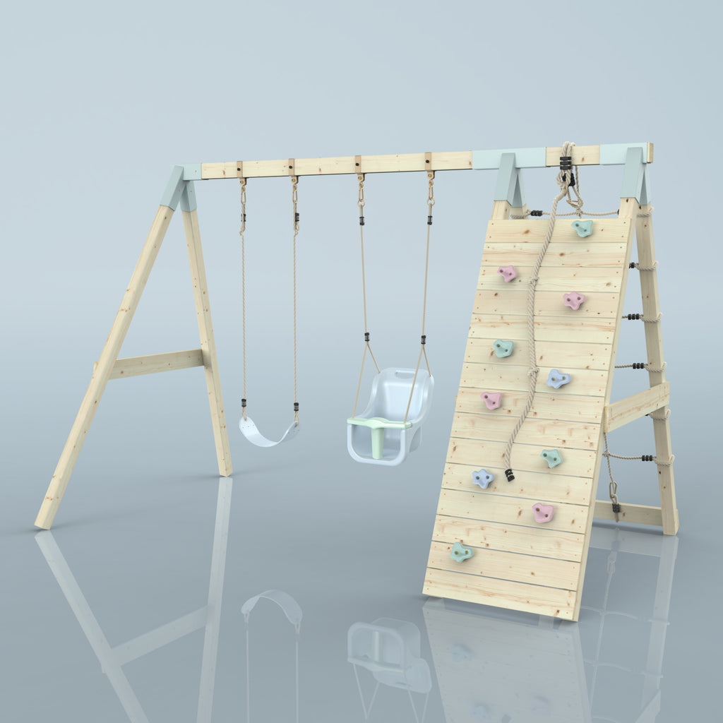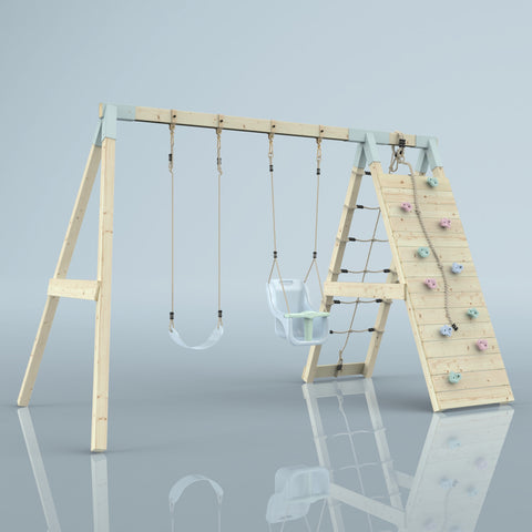 Notre portique à grimper PolarPlay Coucou est particulièrement adaptée aux frères et sœurs qui aiment plonger ensemble dans leur imagination. En plus des deux sièges de balançoire, tes enfants peuvent se défouler pendant des heures sur le mur d'escalade et les filets à grimper.