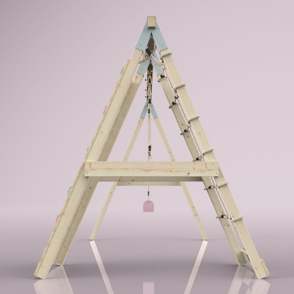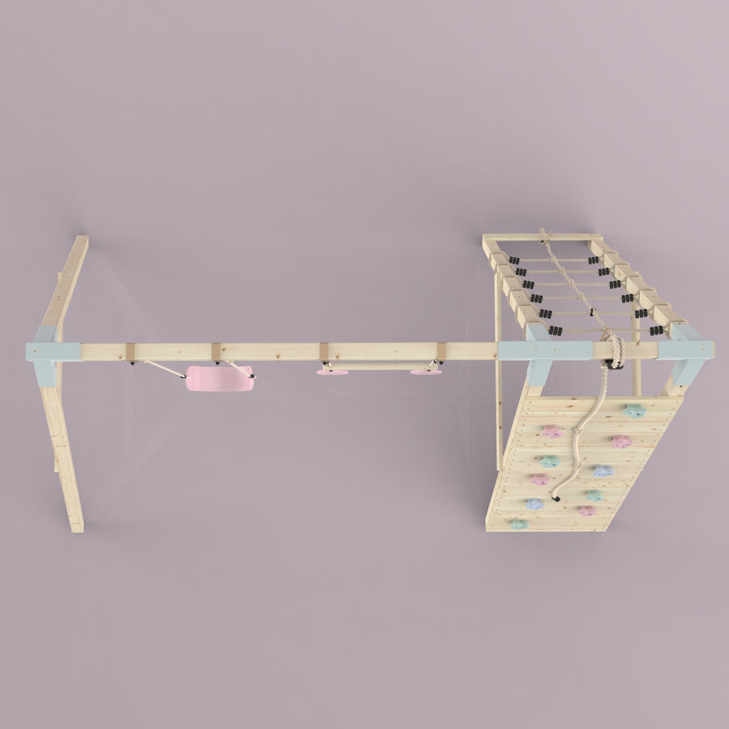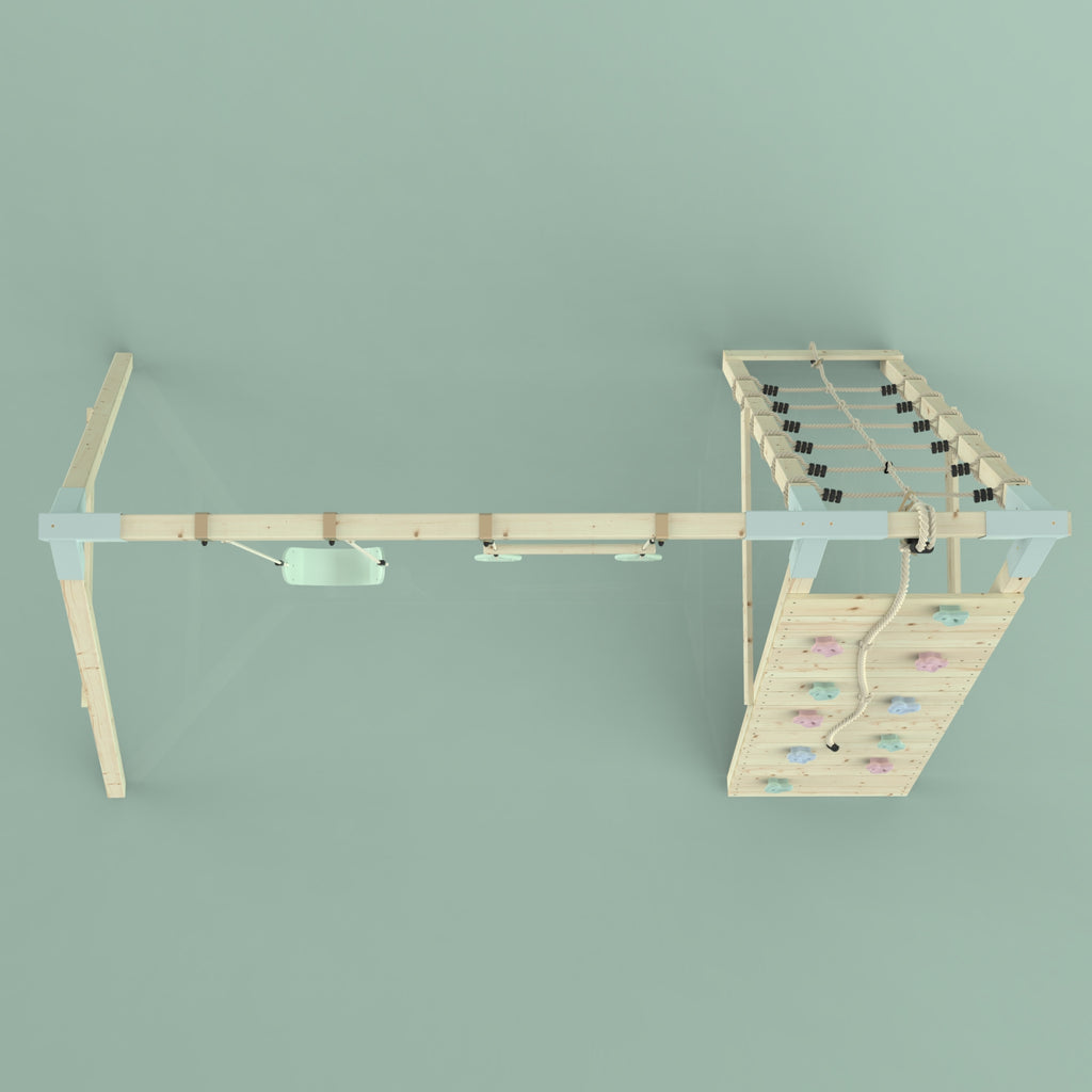En plus de la balançoire et de la barre de trapèze, tes enfants peuvent aussi se défouler pendant des heures sur le mur d'escalade et les filets à grimper.