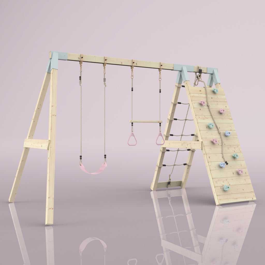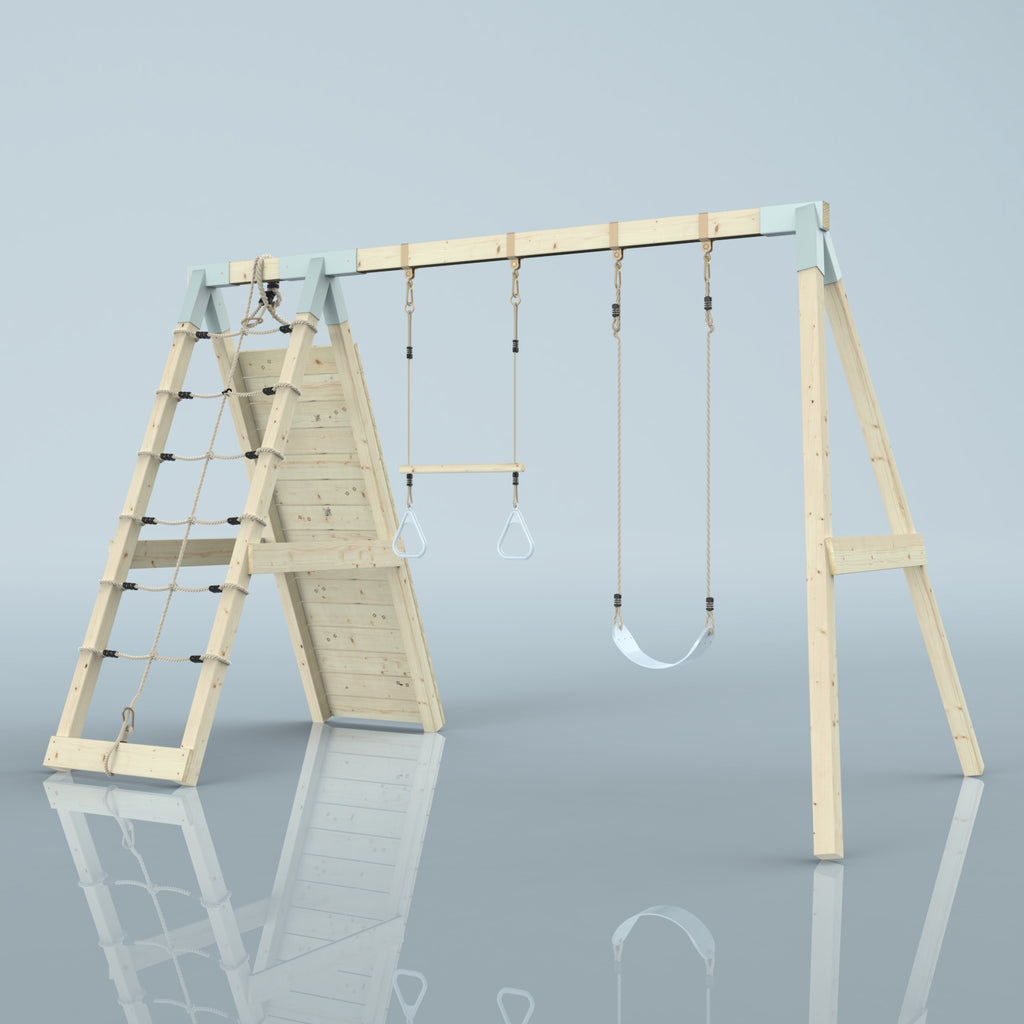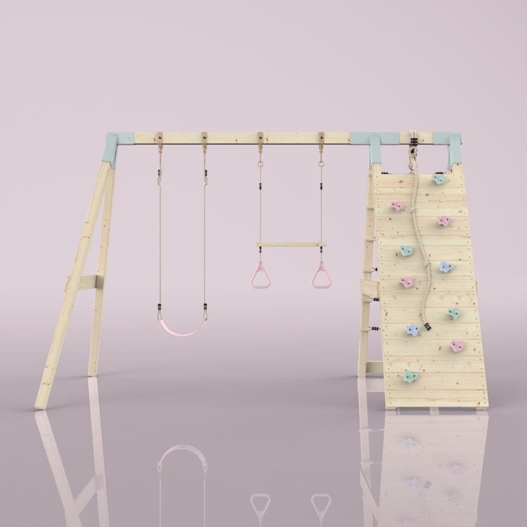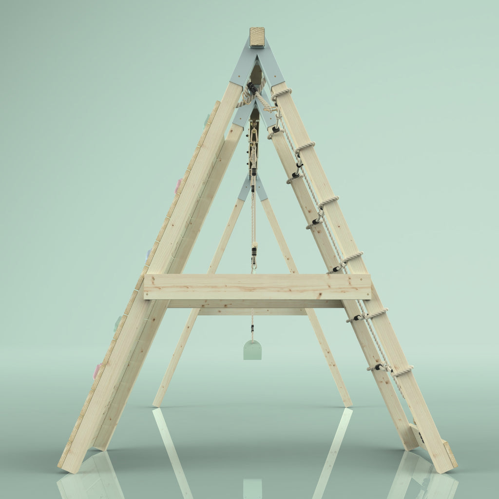 En plus de la balançoire et de la barre de trapèze, tes enfants peuvent aussi se défouler pendant des heures sur le mur d'escalade et les filets à grimper.
